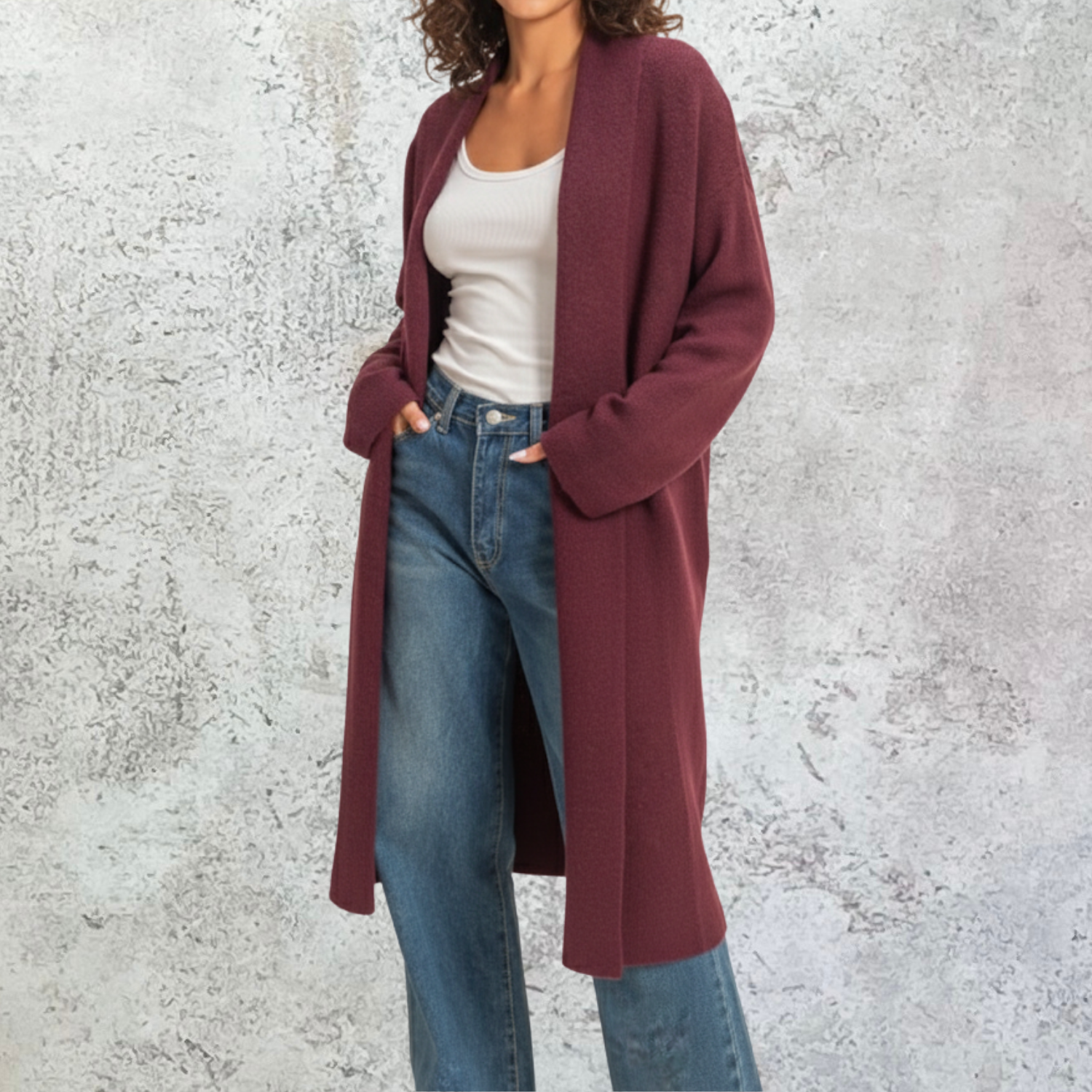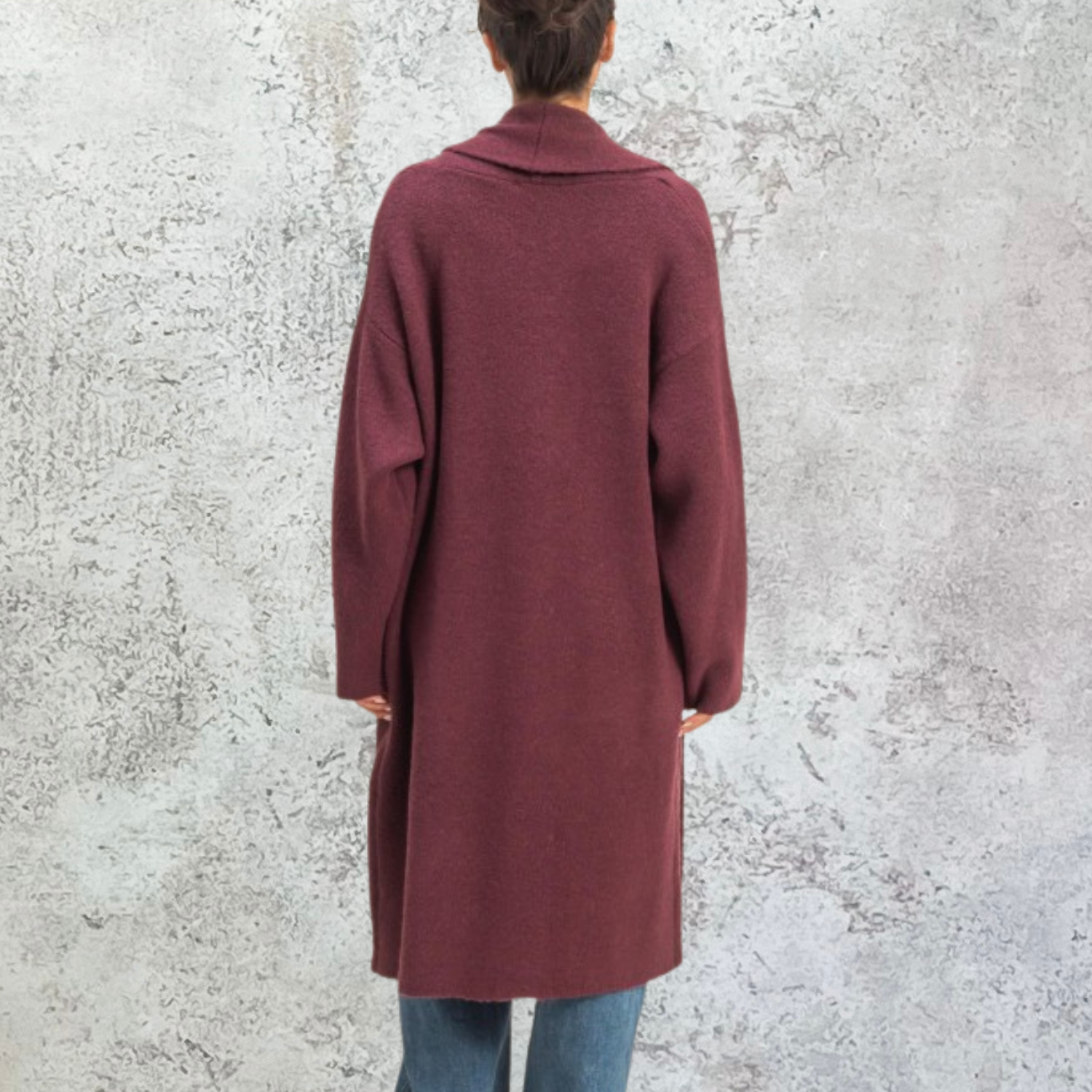 Abrigo tejido en punto grueso con textura suave. Corte recto y abierto sin cierre, con bolsillos laterales y hombro caído. Largo por debajo de la rodilla.