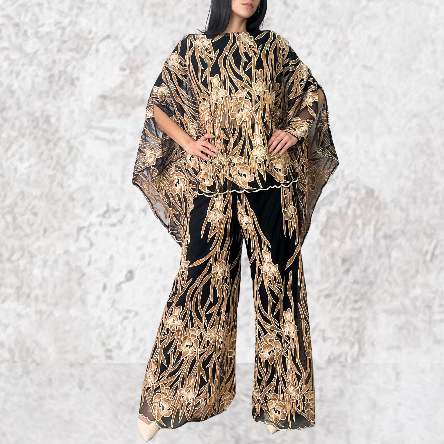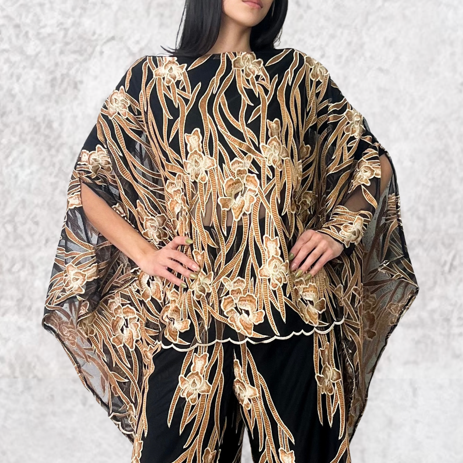 Blusa negra de tul transparente con detalles de flores bordados en color café.