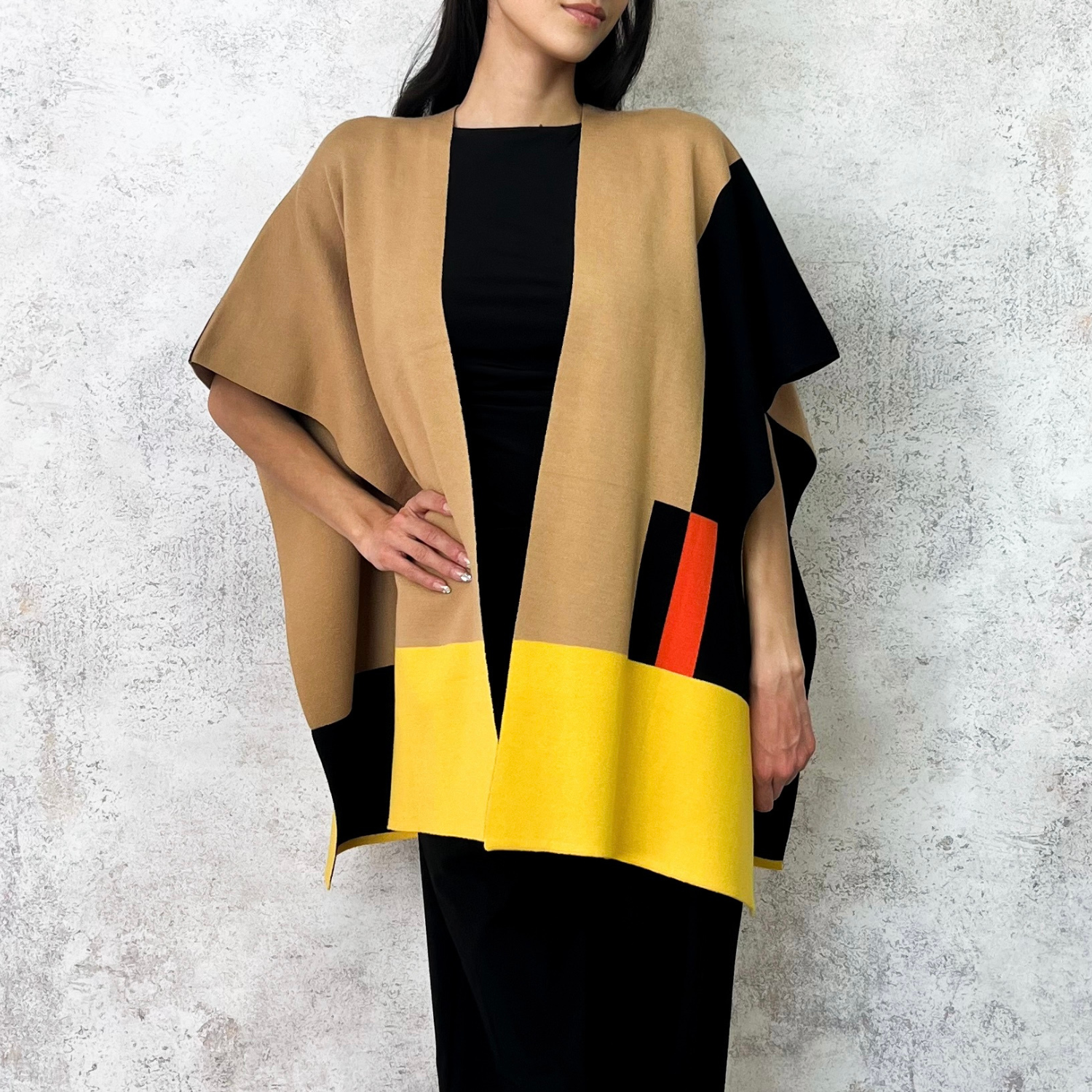Capa oversize en tejido de punto suave. Bloques de color en camel y negro con detalle en amarillo