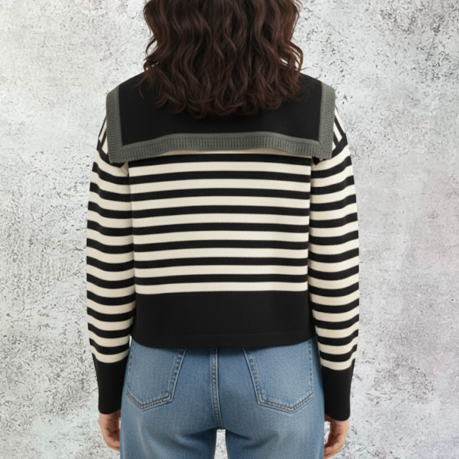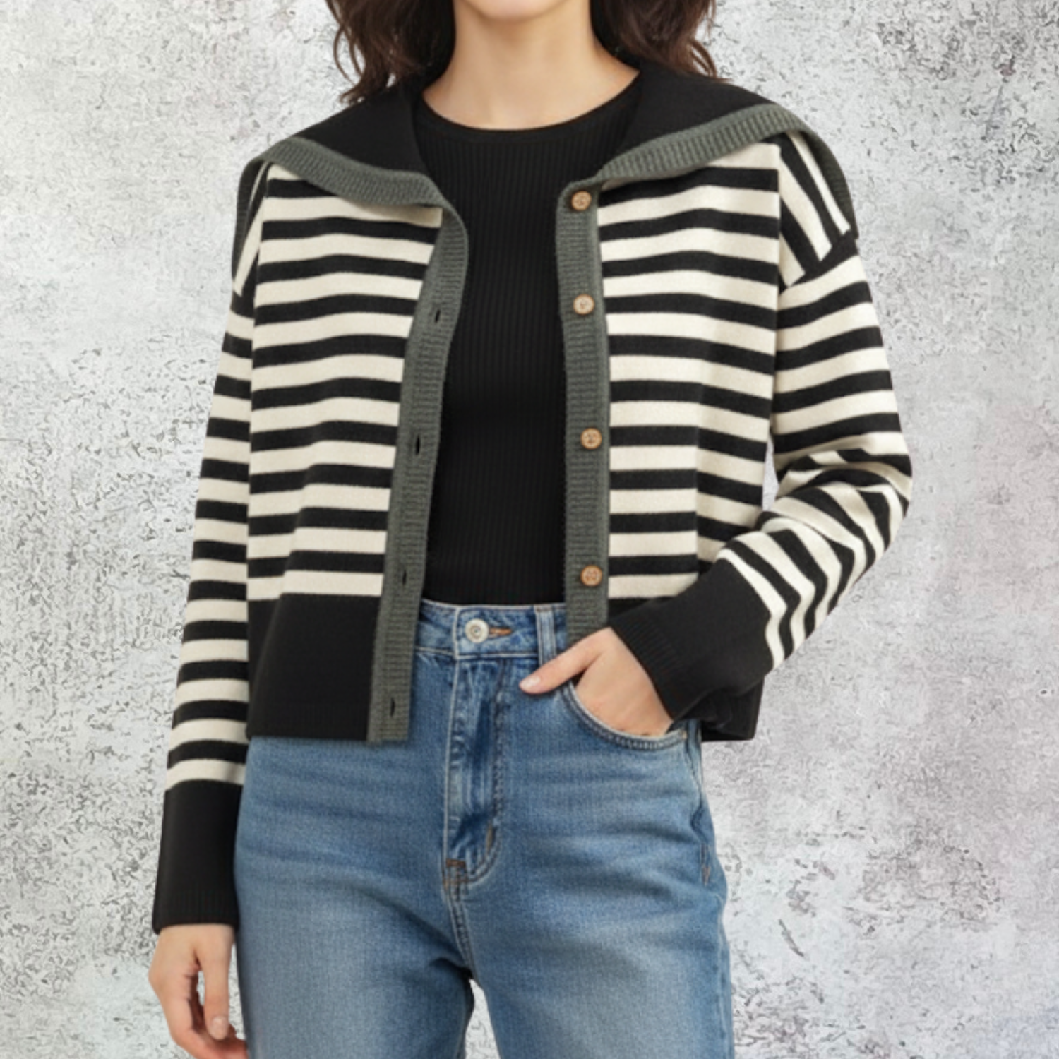 Cárdigan de punto grueso con diseño a rayas y cuello amplio tipo marinero. Cierre frontal con botones y acabados acanalados en puños y bajo.