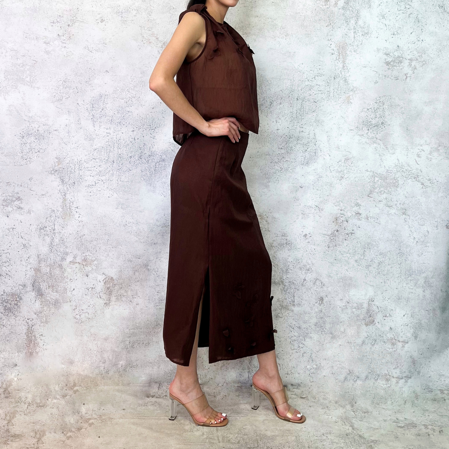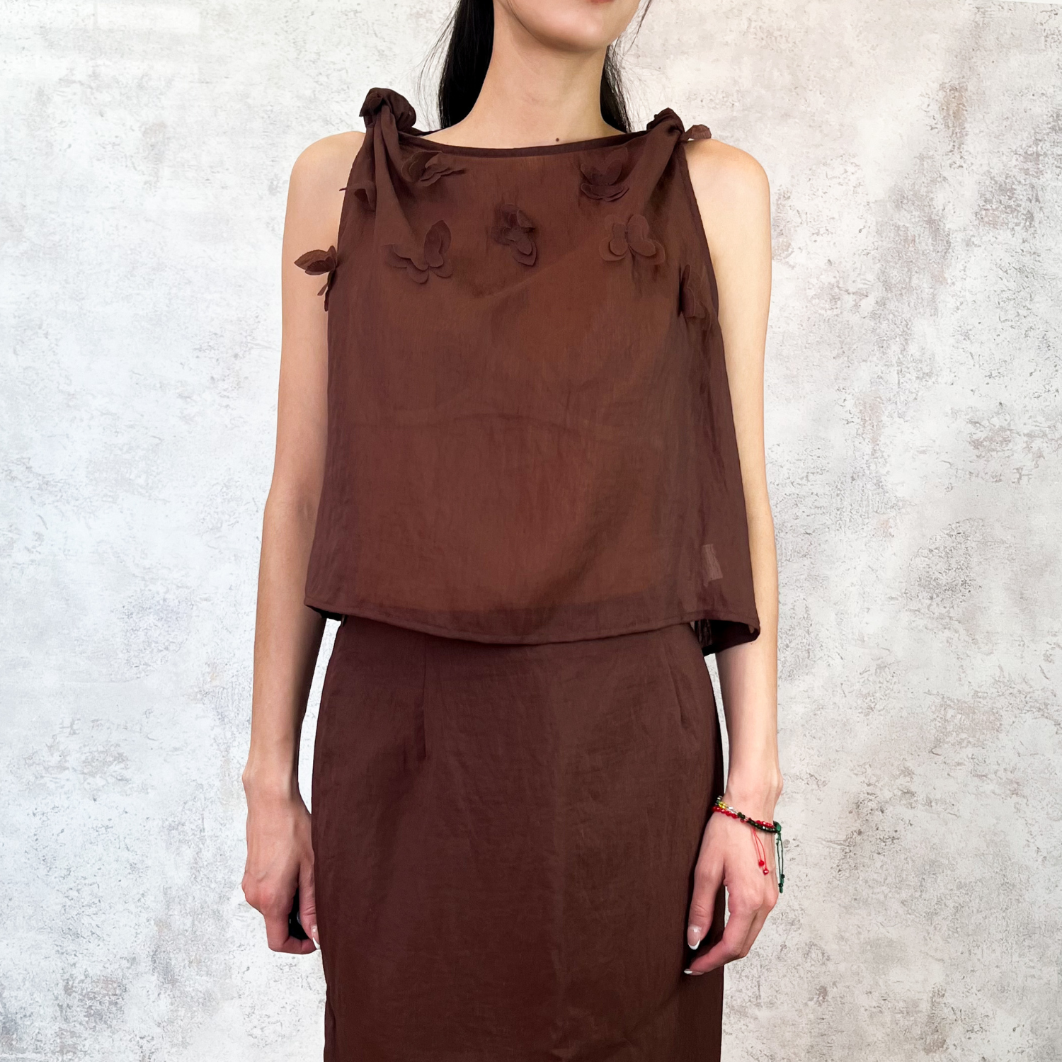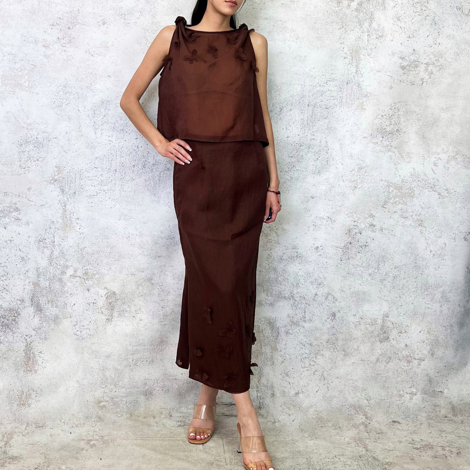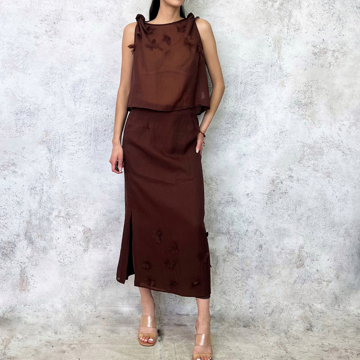 Conjunto de falda y blusa con flores resaltadas, nudillos en tirantes, falda corte midi.