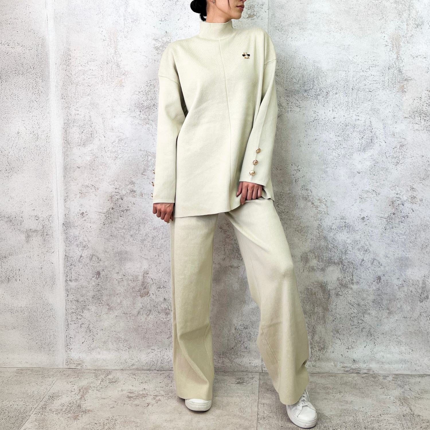 Conjunto de punto color beige, dos piezas confeccionadas en tejido de punto grueso con acabado suave. Suéter de cuello alto con caída relajada, manga larga y detalle de botones metálicos en el puño.