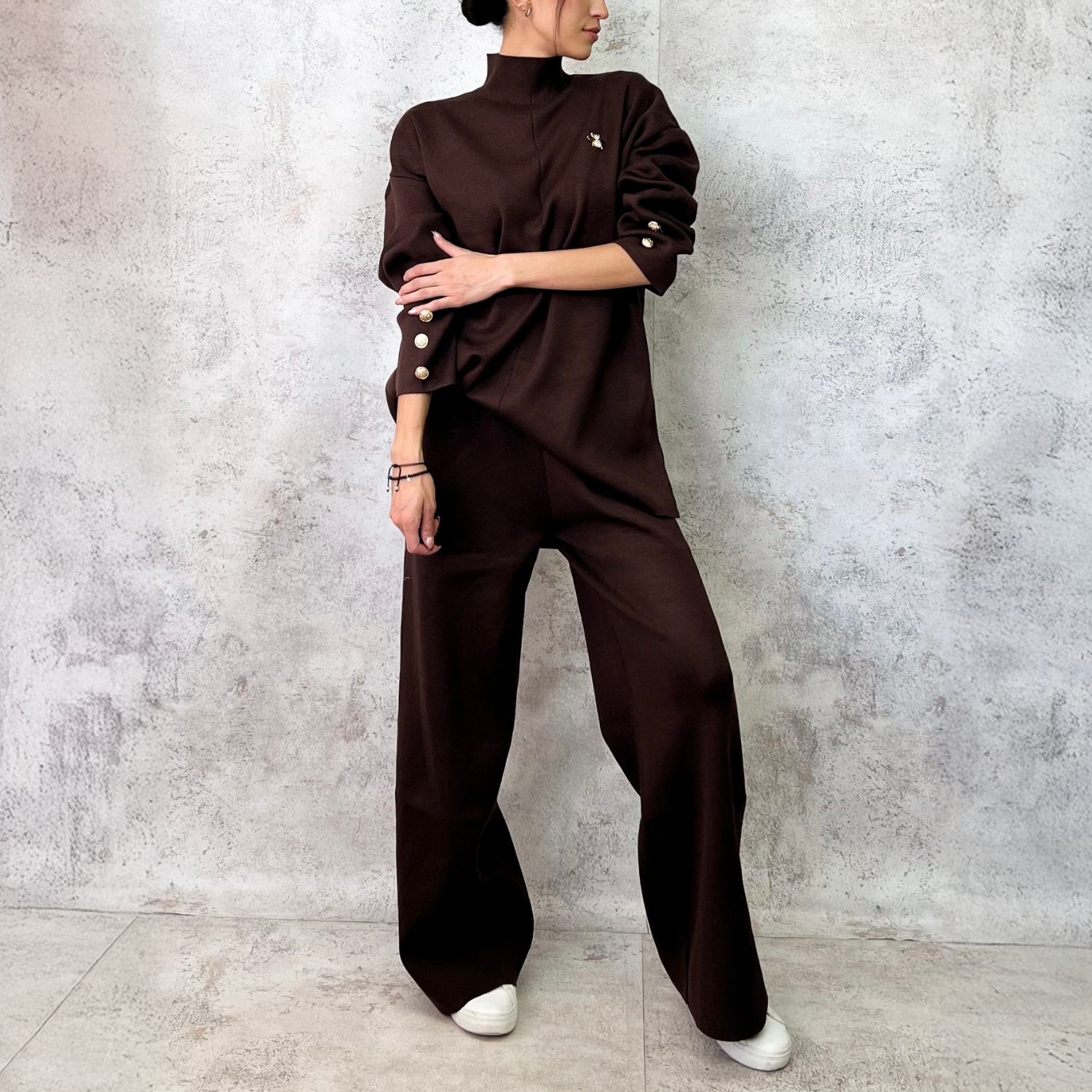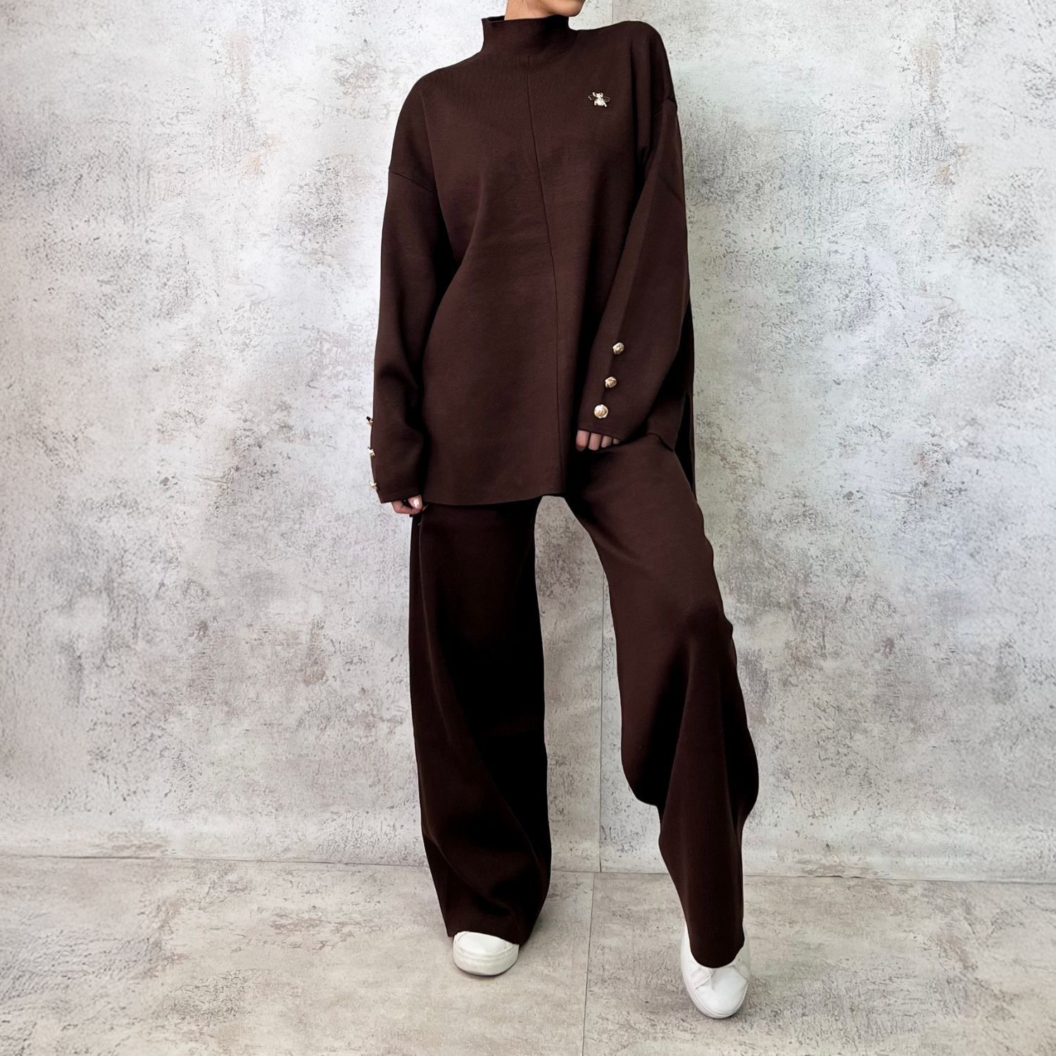 Conjunto de punto color chocolate, dos piezas confeccionadas en tejido de punto grueso con acabado suave. Suéter de cuello alto con caída relajada, manga larga y detalle de botones metálicos en el puño.
