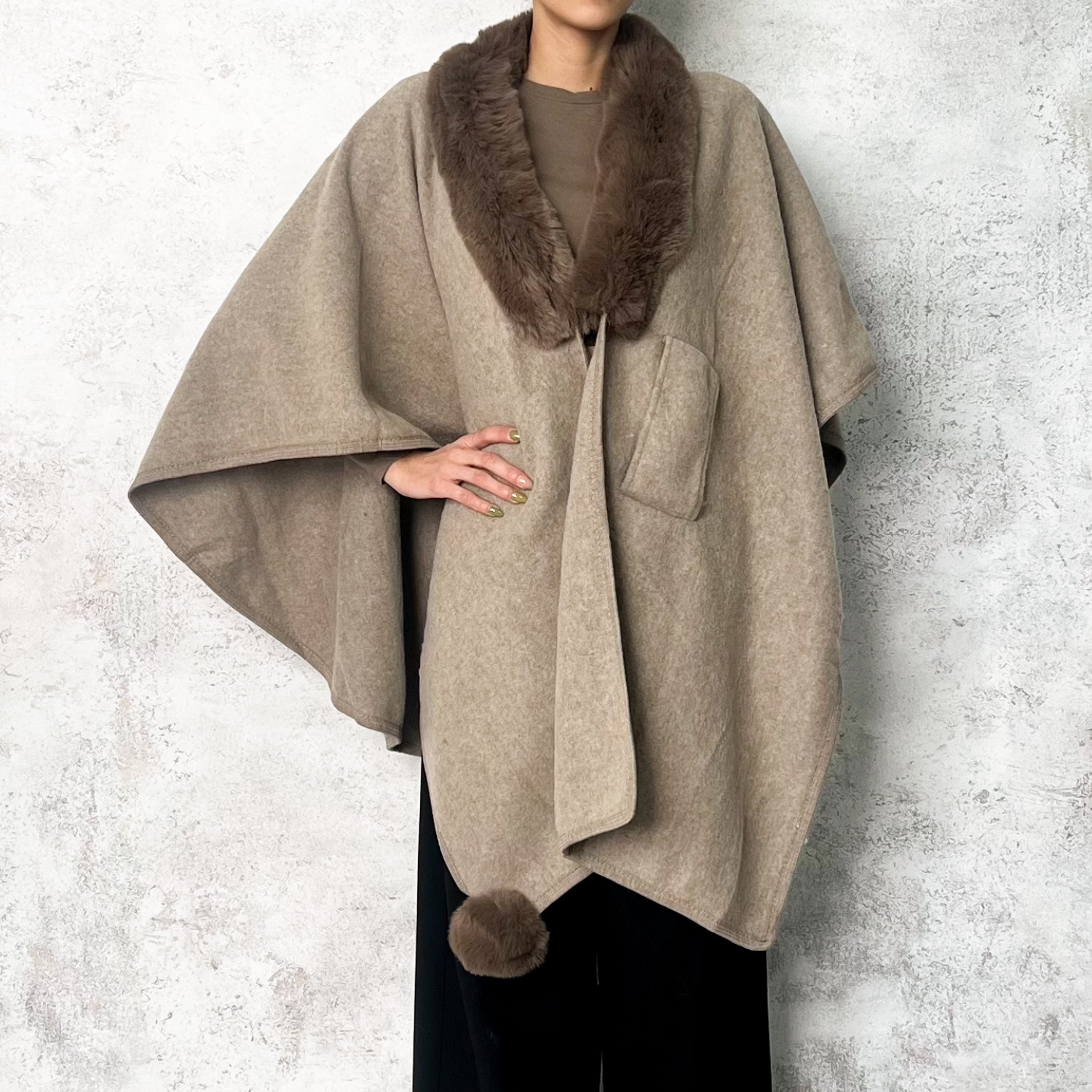 Poncho taupe con piel sintética alrededor en cuello.