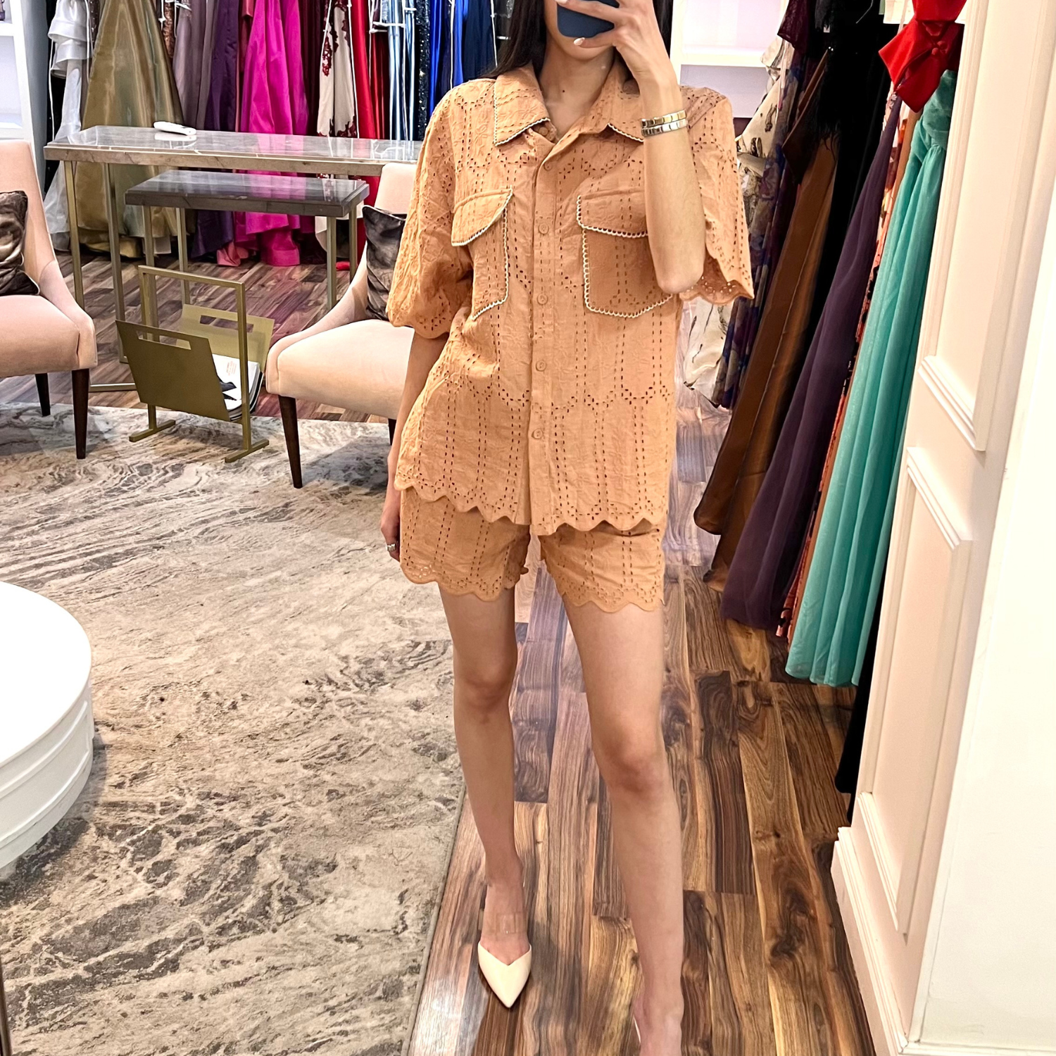 Set de blusa y short color camel. Manga corta blusa con detalle de bolsas al busto y estilo craquelado.