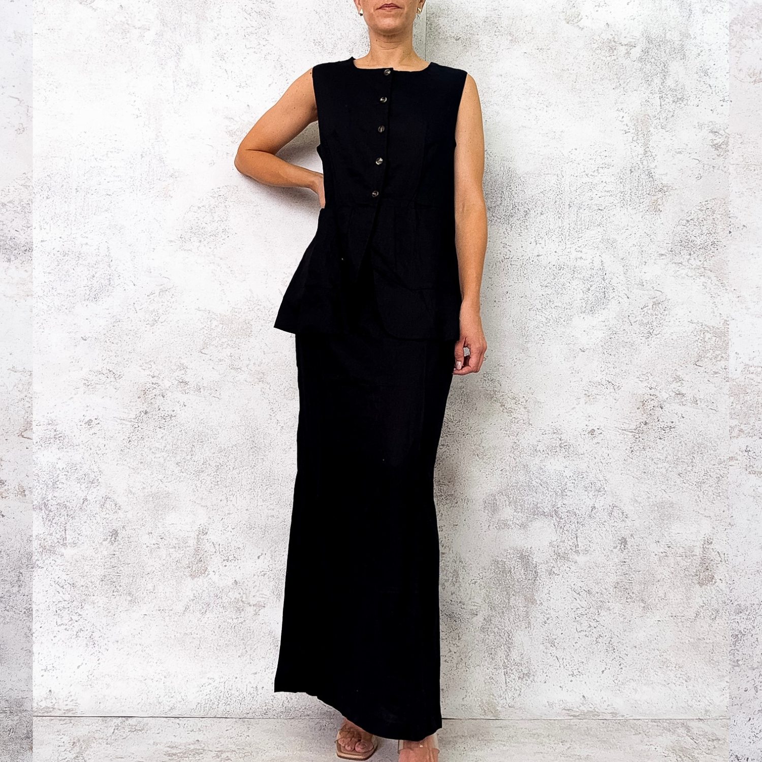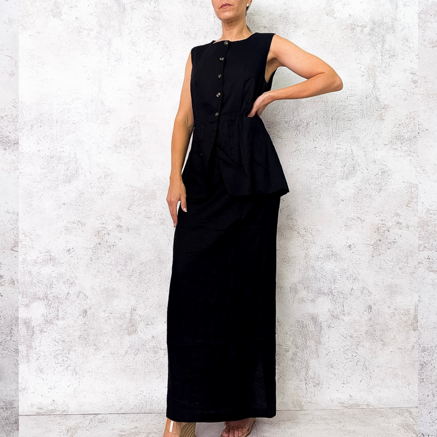 Set de falda y chaleco en lino color negro. Chaleco ajustable a la cintura, botones cafés y falda corte midi.