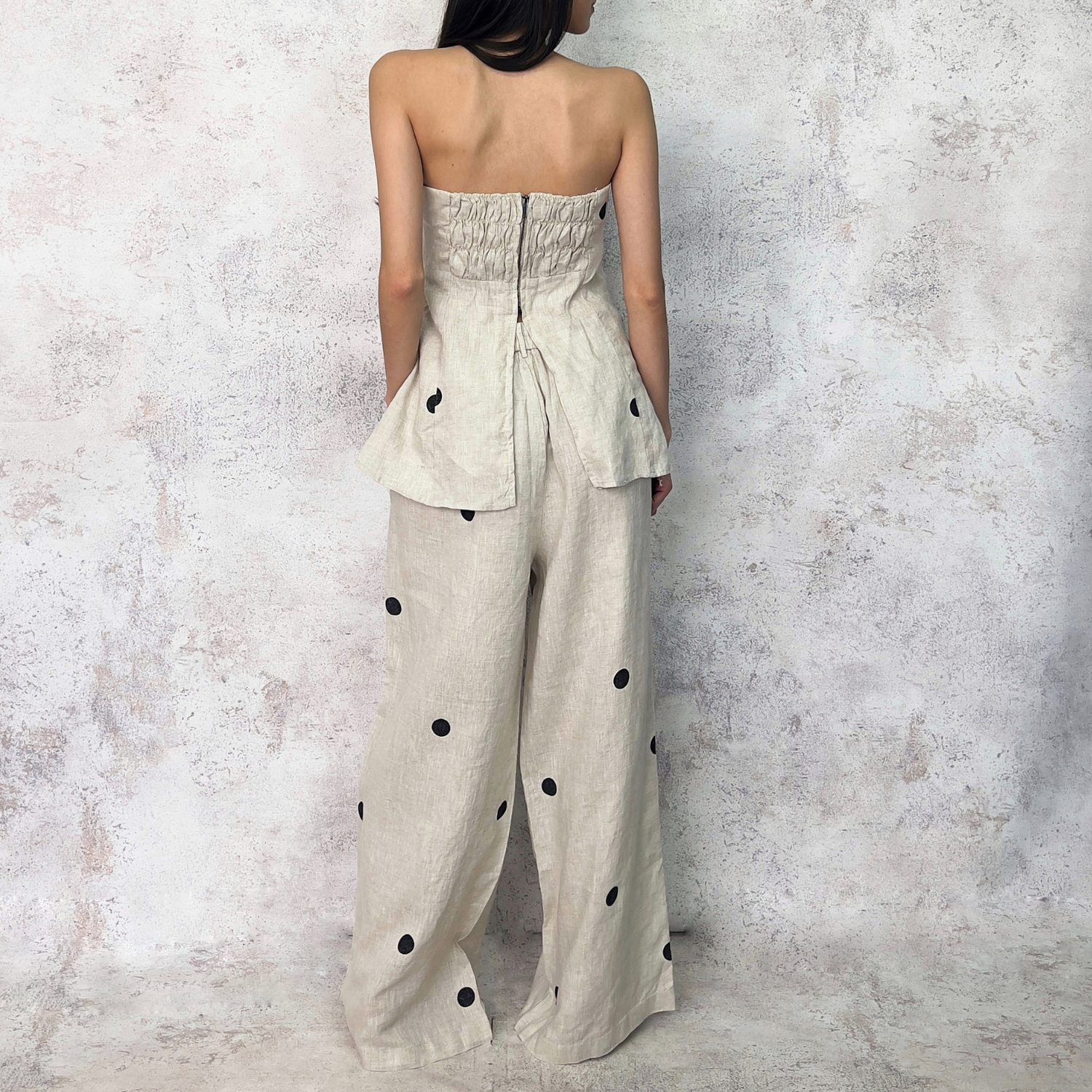 Conjunto de pantalón y blusa strapless, tela de lino. Beige con circulos negro. Blusa con elástico en cintura.