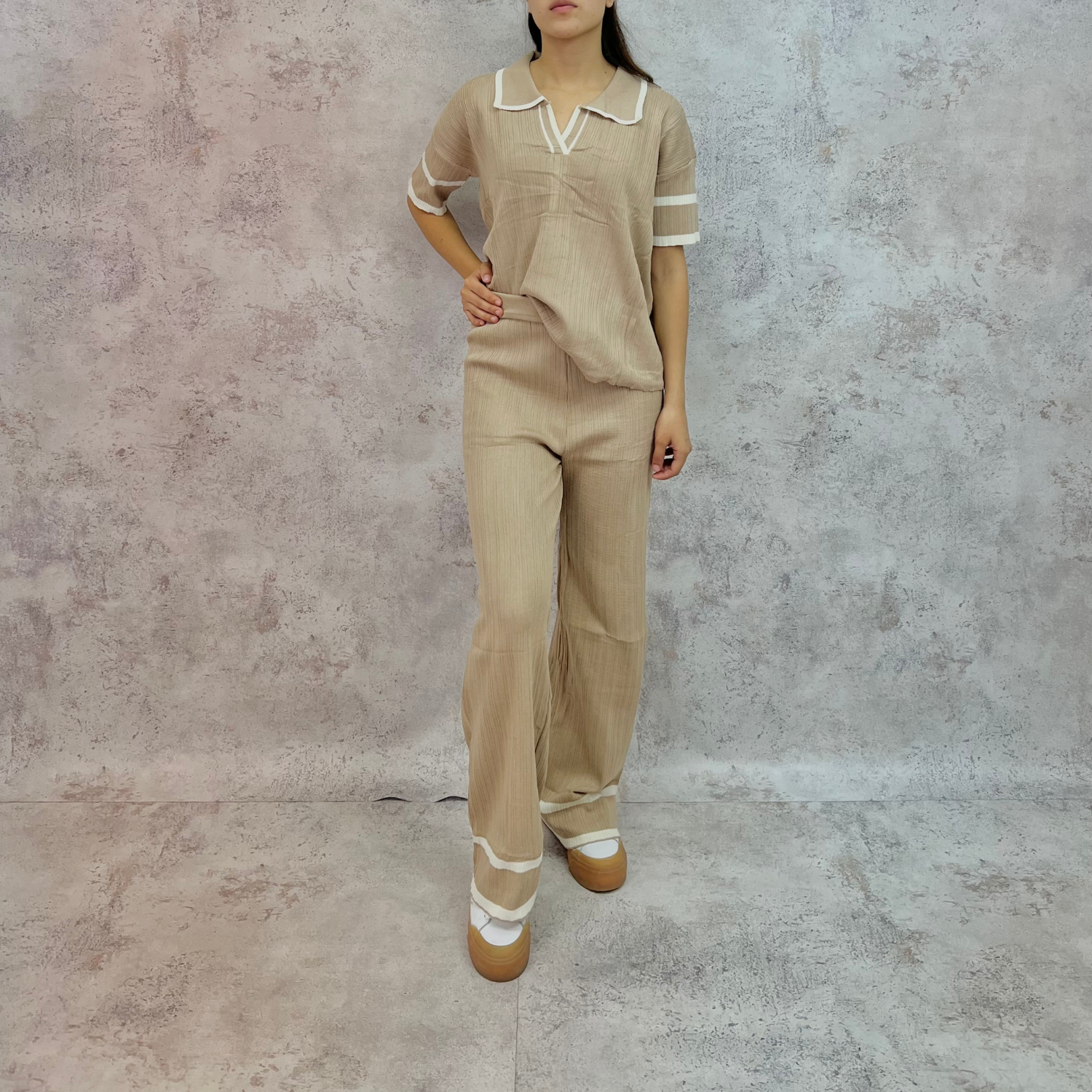 Set de blusa y pantalón en tejido color moka. Cuello tipo polo con diseño de líneas en orillas, pantalón recto, y tiro alto.
