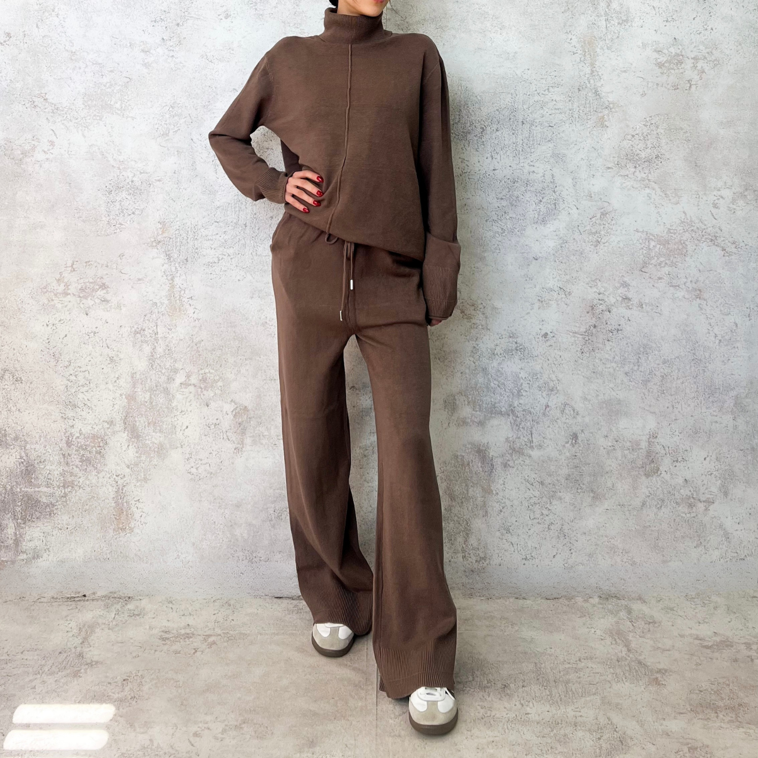 Set de punto fino, pantalón y cárdigan largo, cuello alto.