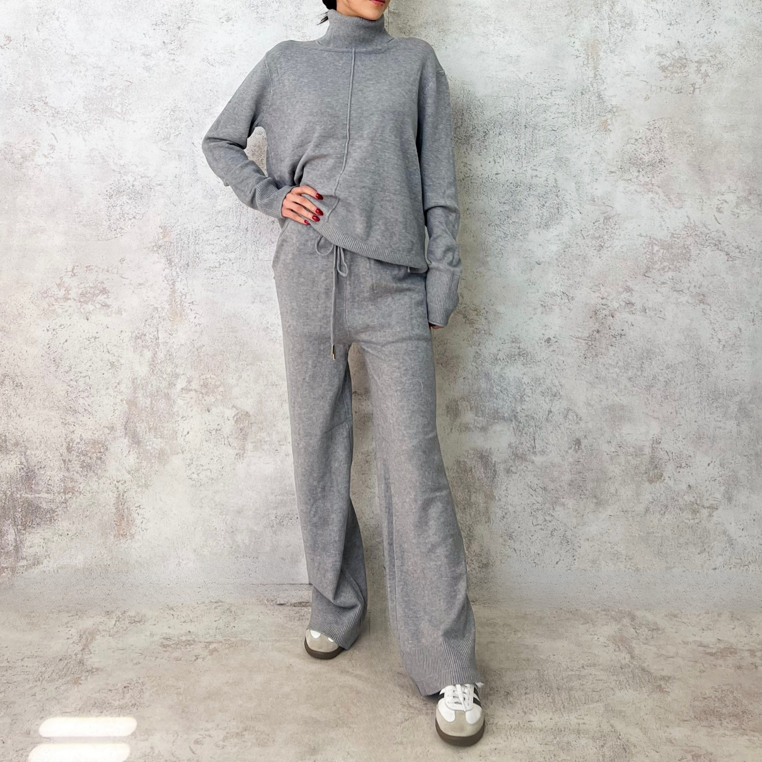 Set de punto fino, pantalón y cárdigan largo, cuello alto.