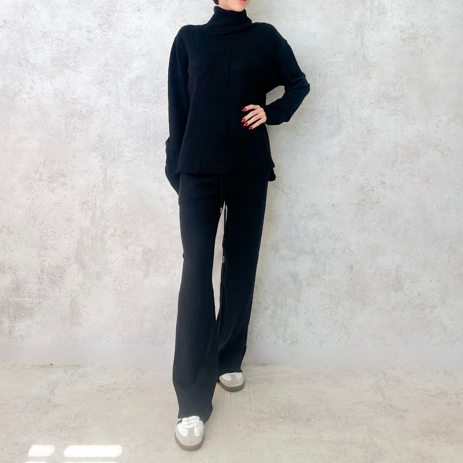 Set de punto fino, pantalón y cárdigan largo, cuello alto.