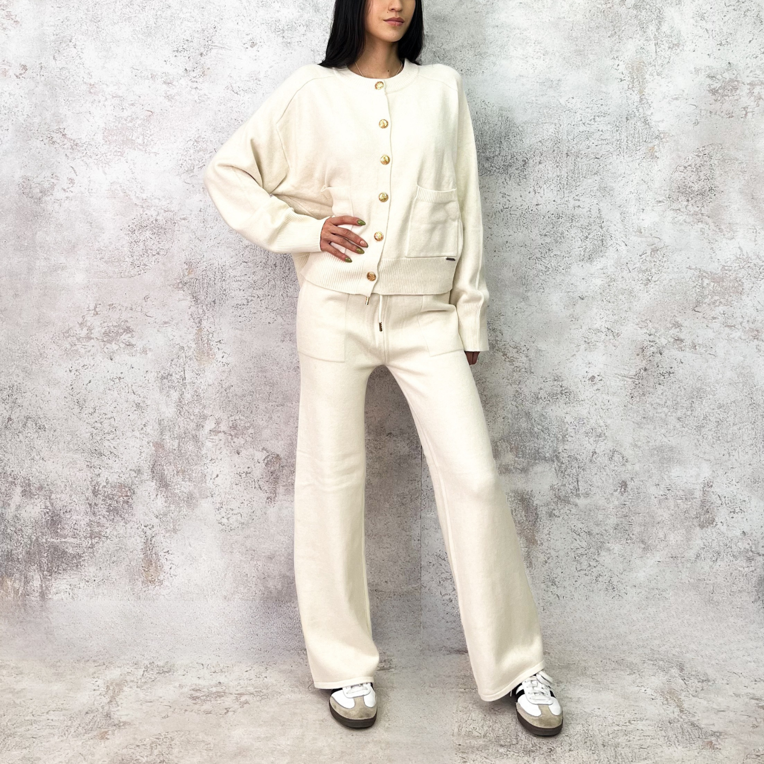 Set tejido beige en punto fino, con botones dorados en suéter.