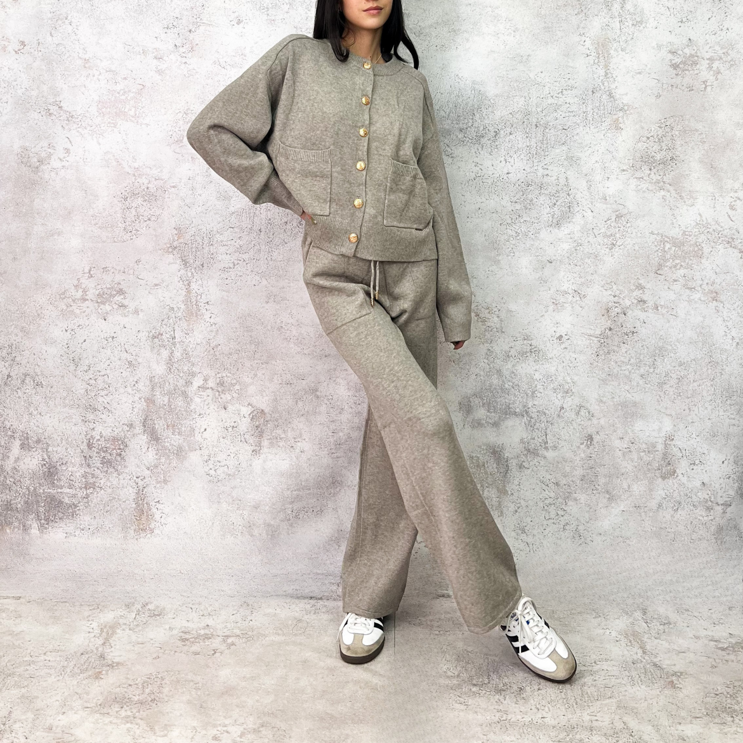 Set tejido taupe en punto fino, con botones dorados en suéter.