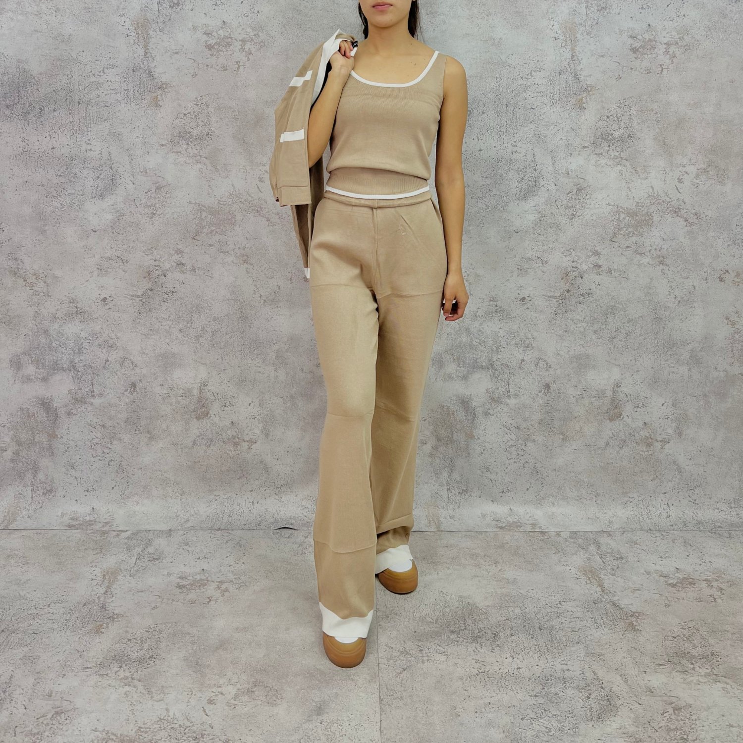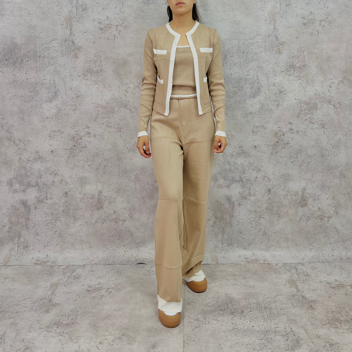 Set de tres piezas blusa, pantalón y suéter en color moka.