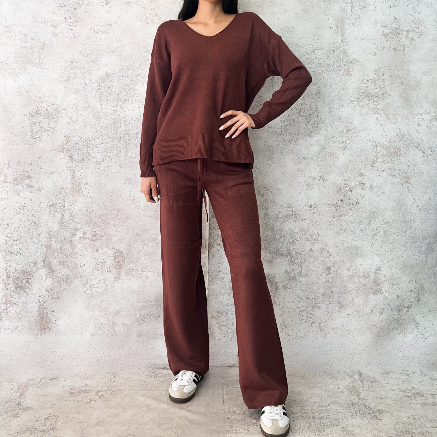 Set de punto fino, pantalón y cárdigan largo, cuello V.