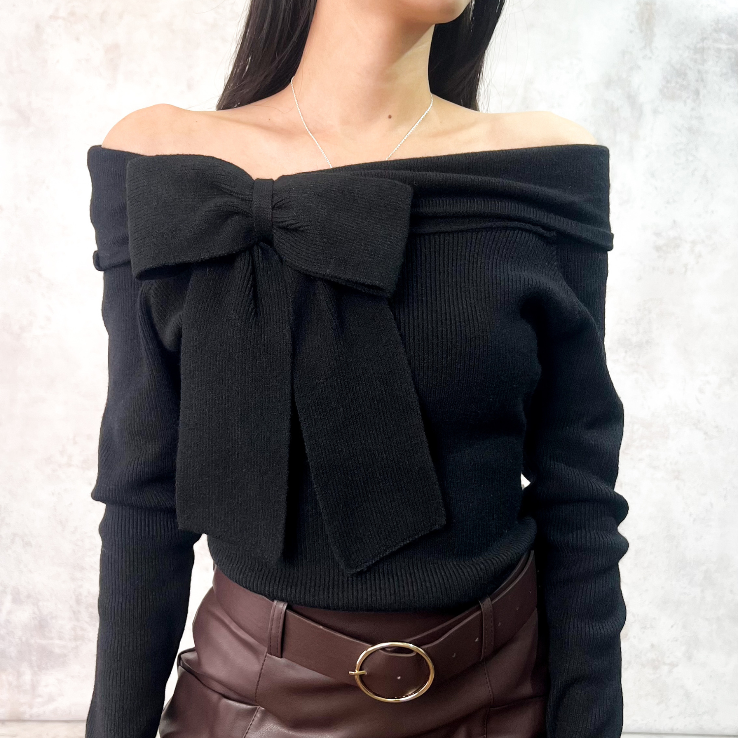 Suéter tejido en color negro, hombros descubiertos con detalle de hombros.