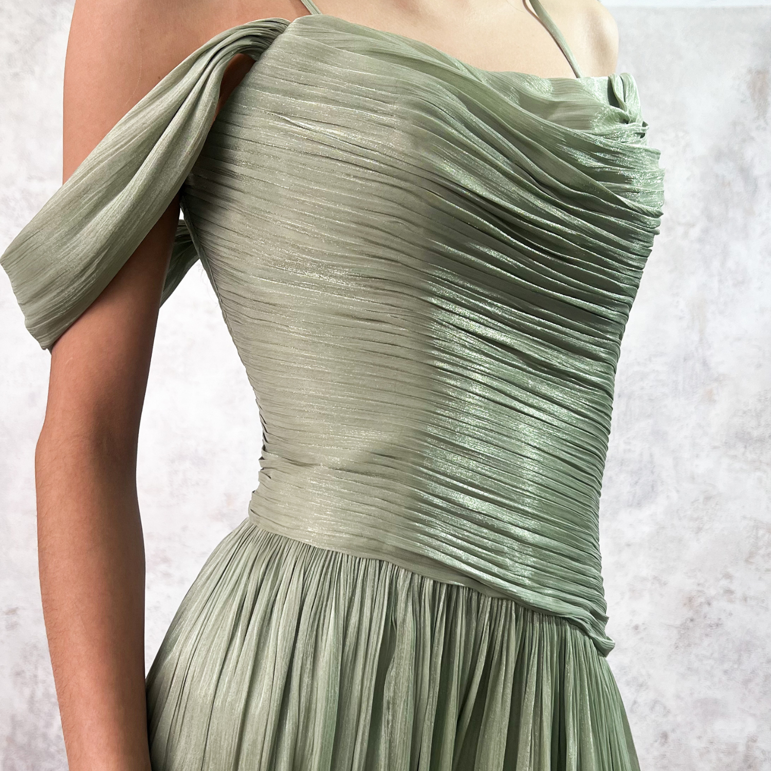 Vestido en color sabia largo, escote asimétrico plisado un hombro, falda en corte A. Tela brillosa.