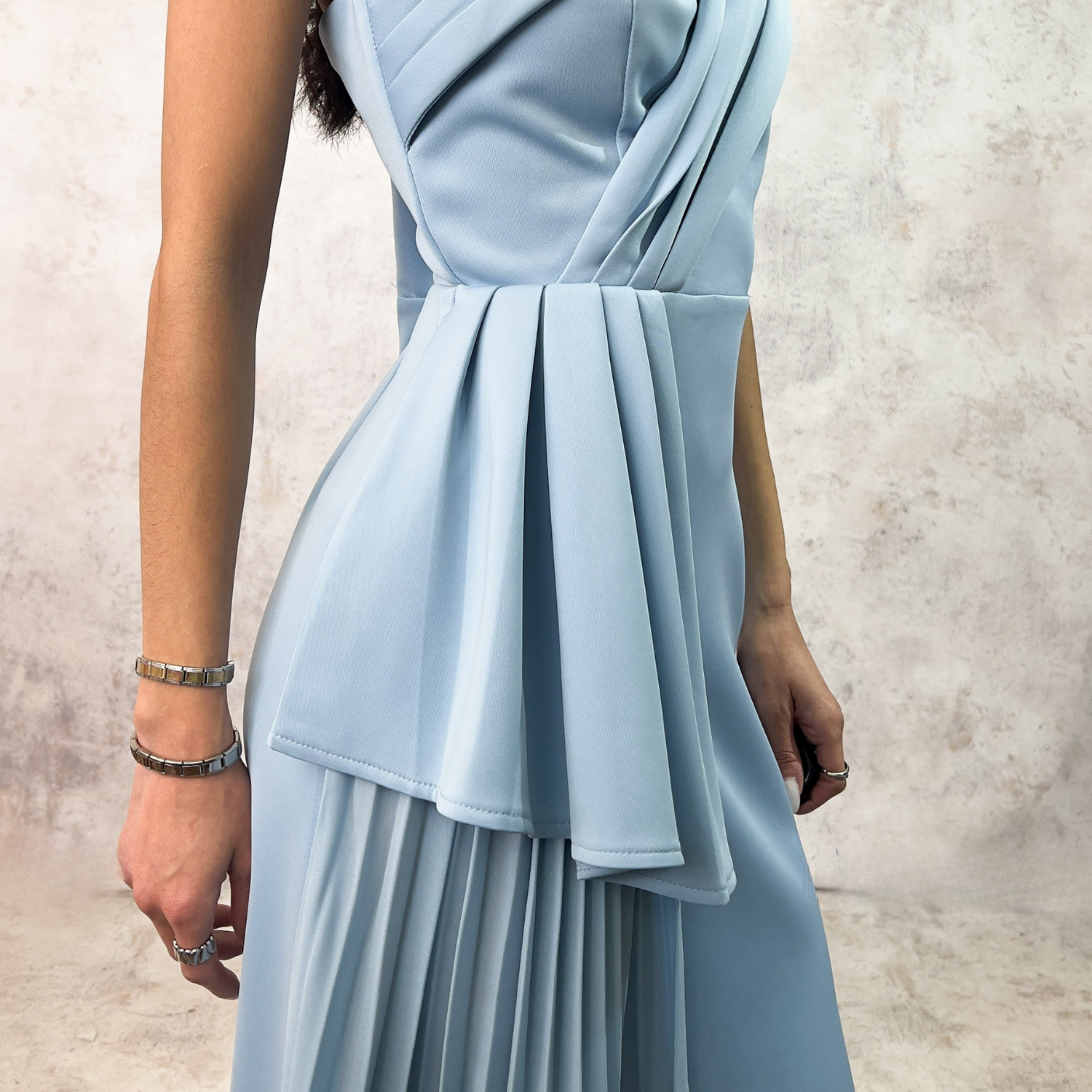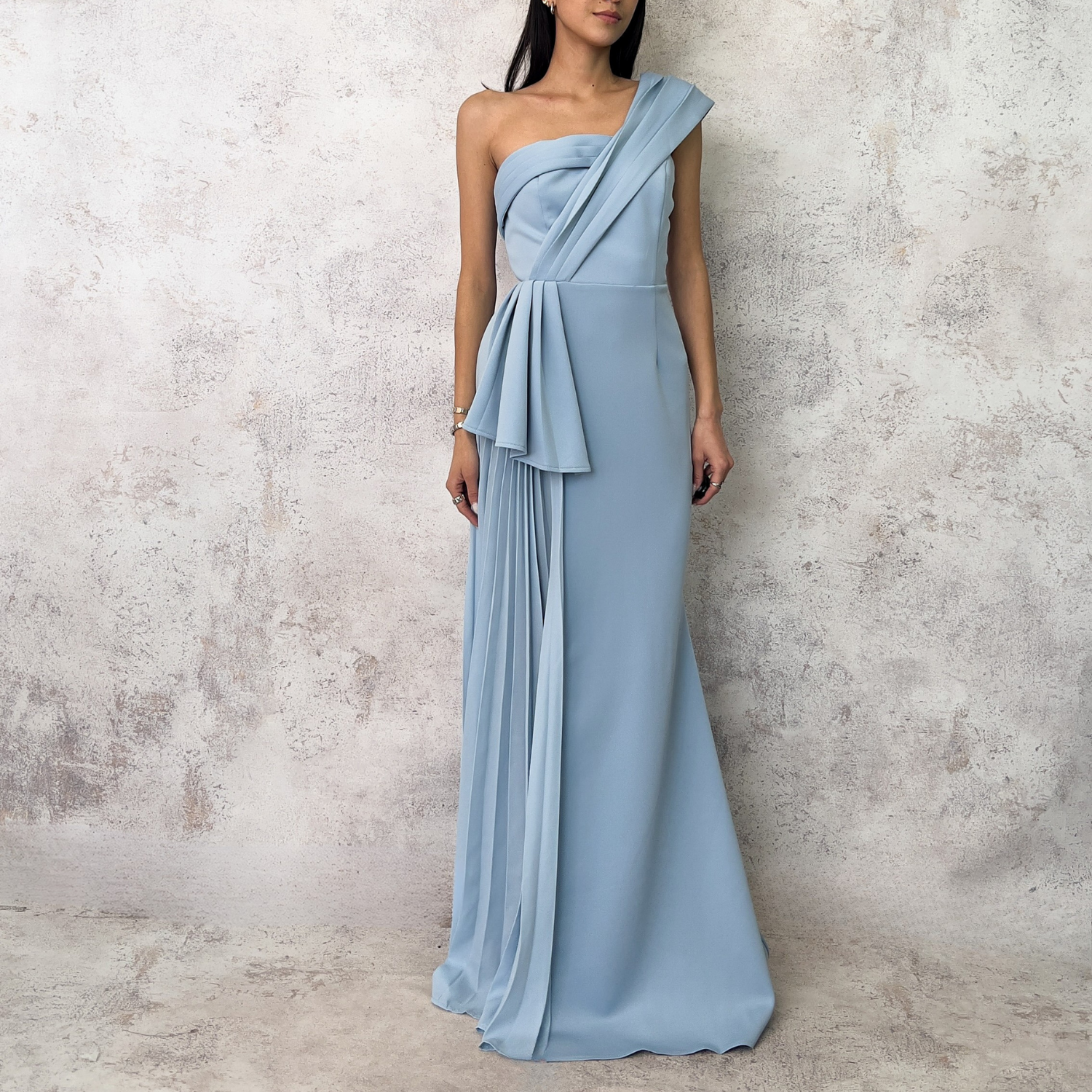 Vestido largo en color azul claro, un hombro asimétrico, tableado en pierna.