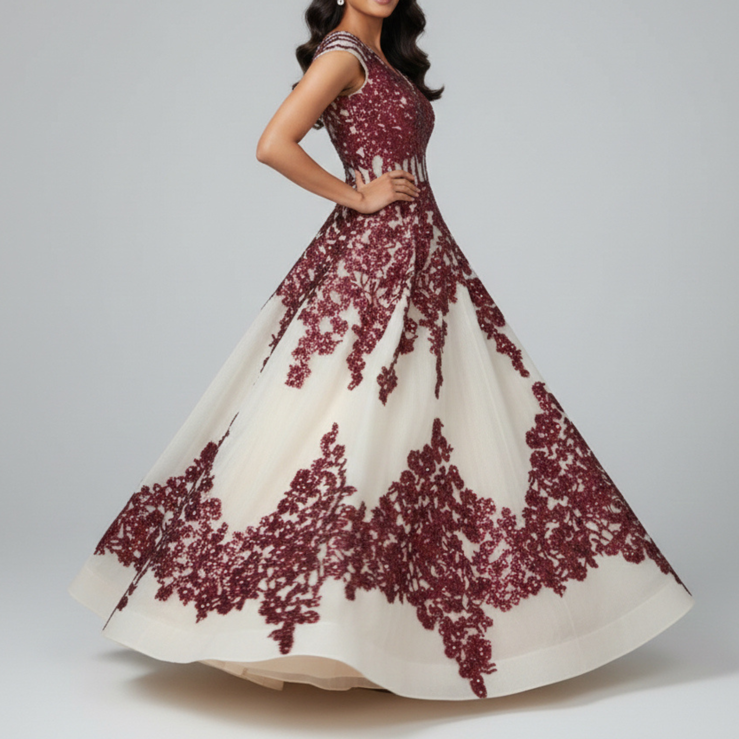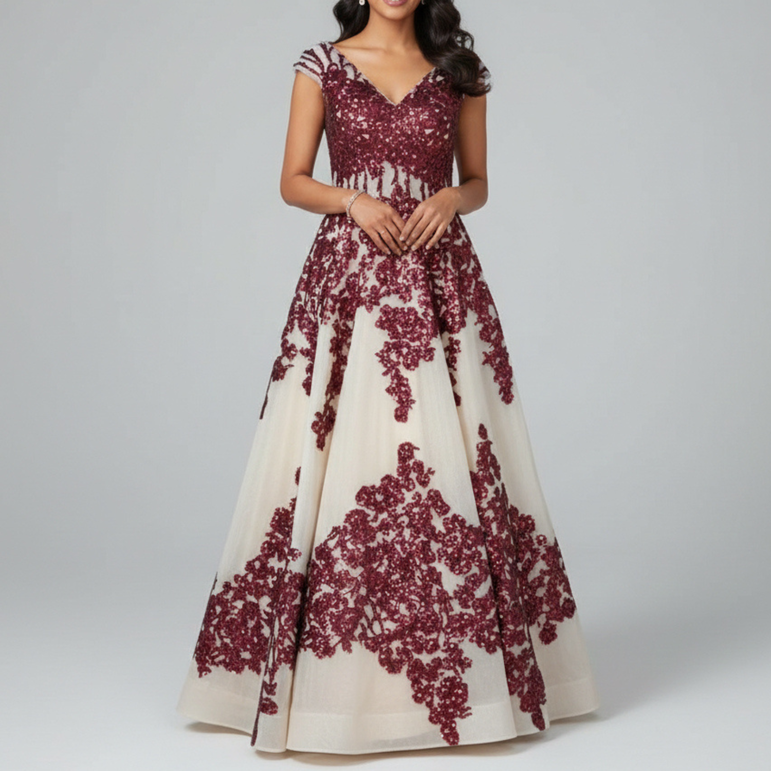 Vestido largo en color vino con tela de organza maya y bordado lentejuela y pedrería vino. Diseño libanes.