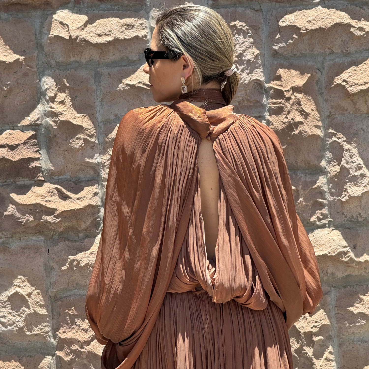Vestido largo en color cafe. con tela de gasa brillosa y mangas largas, cuello alto y escote en espalda.