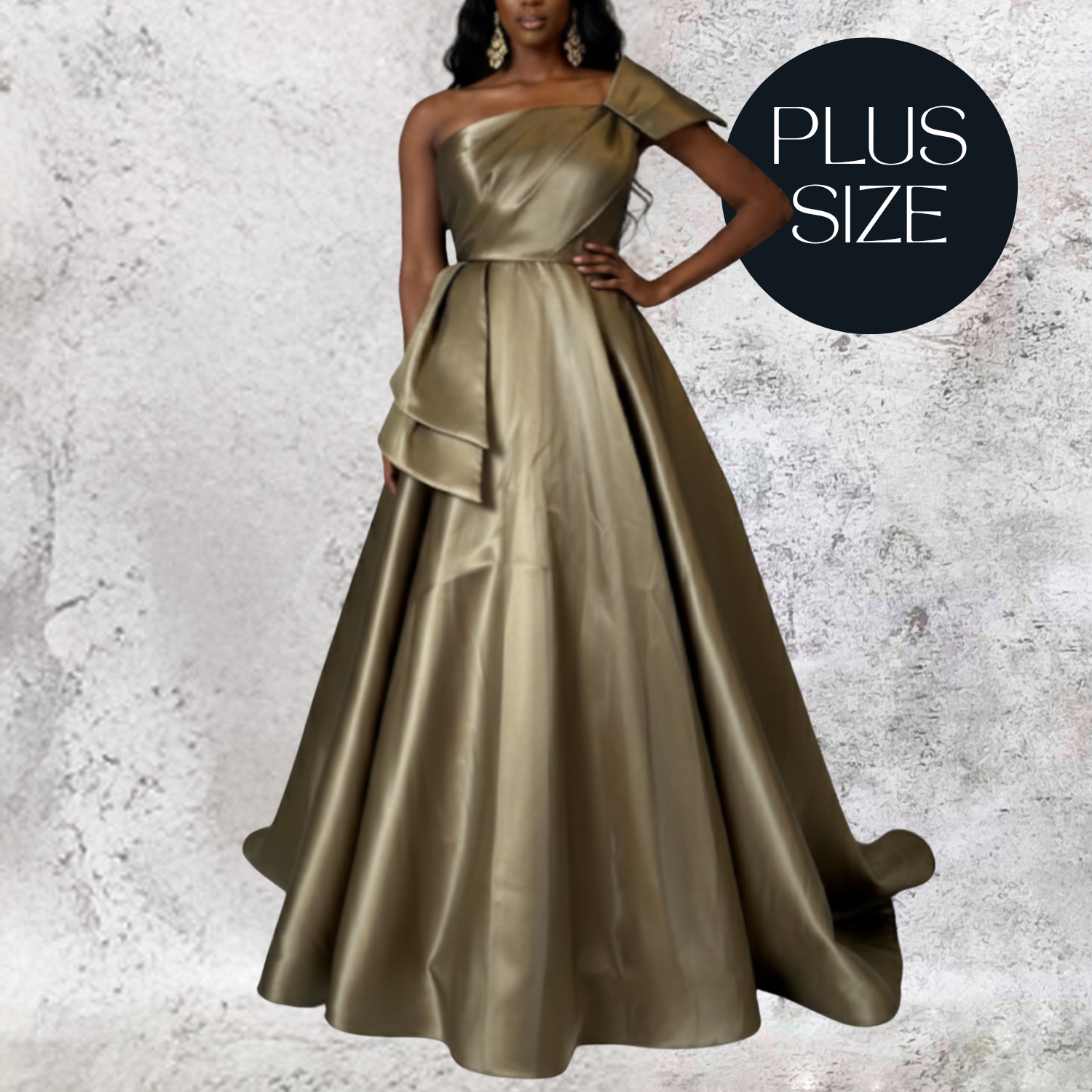 Vestido largo en color dorado nacarado, tela brillosa en tafeta. Corte princesa y detalle de flor en hombro.