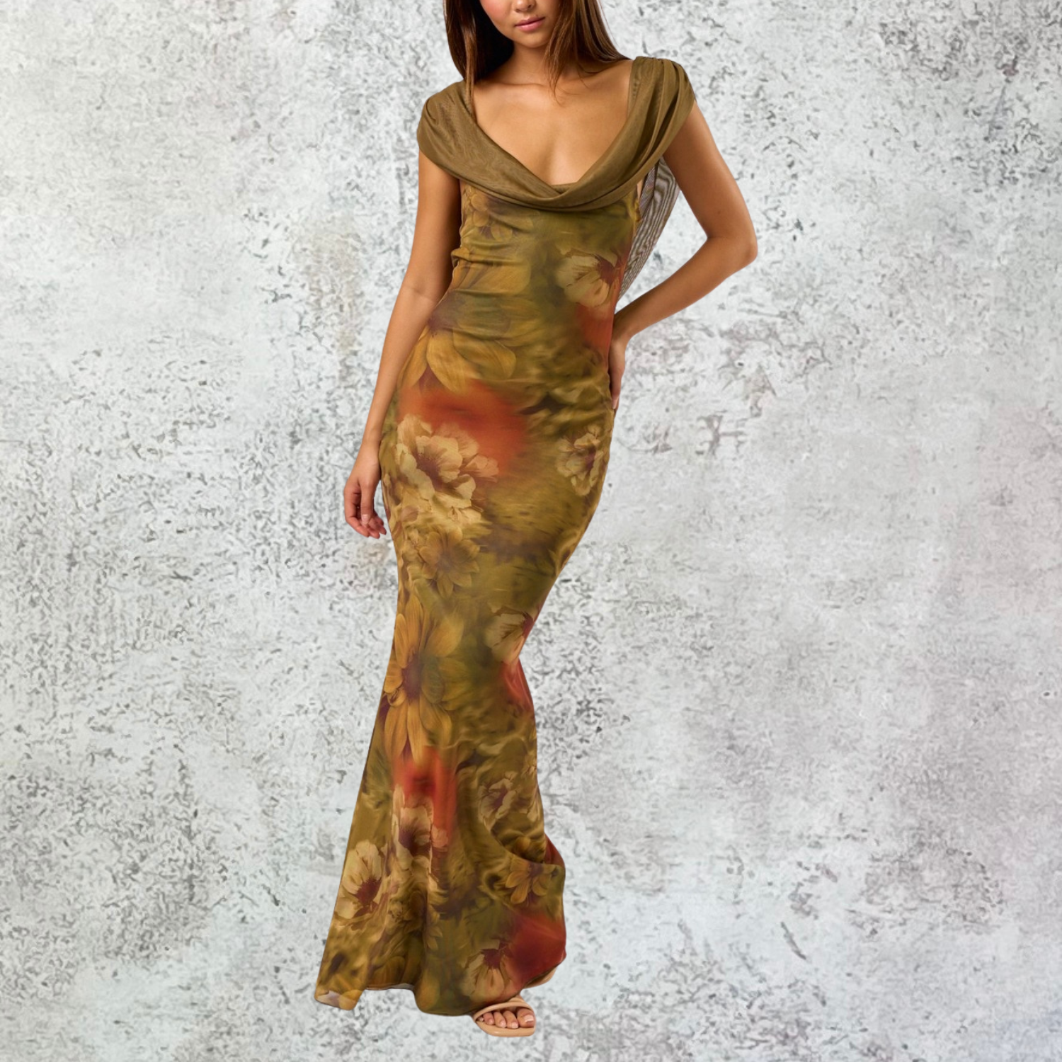 Vestido en corte largo, tela de mesh estampada flores verde olivo, cuello en tipo columpio con cintas en espalda ajustables