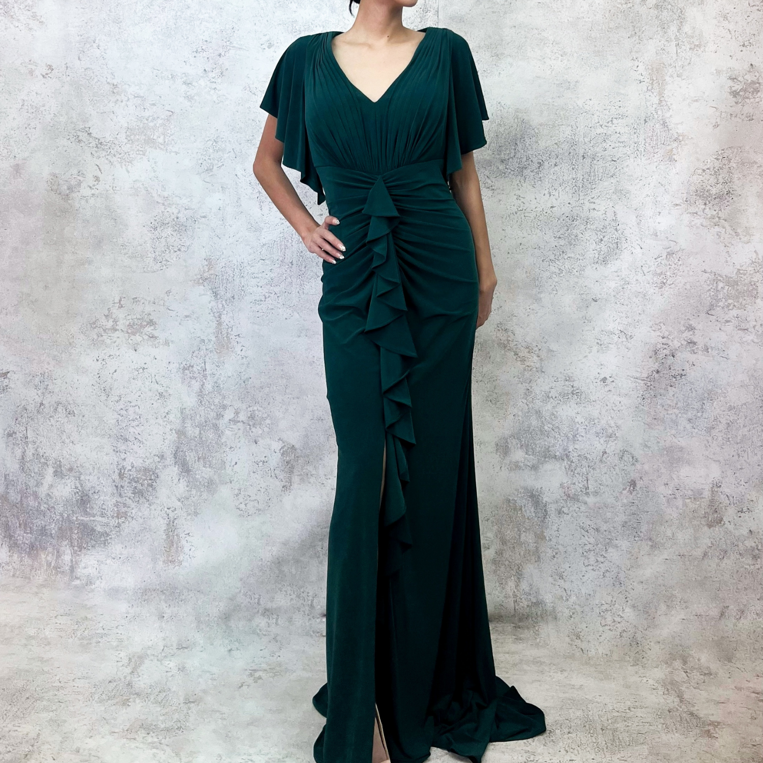 Vestido largo verde licra de manga corta, con abertura frontal en pierna