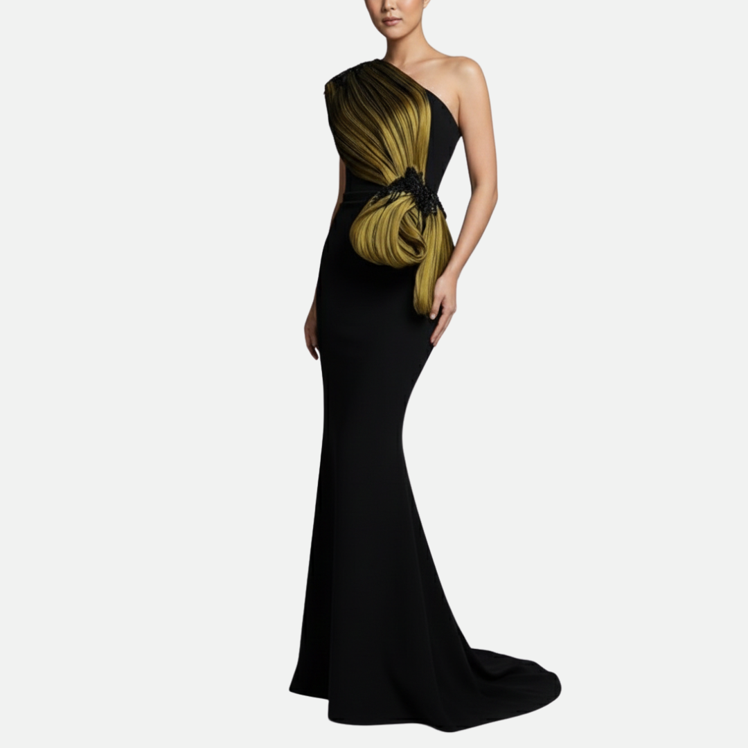 Vestido largo en color negro, con detalle de moño en hombro verde olivo