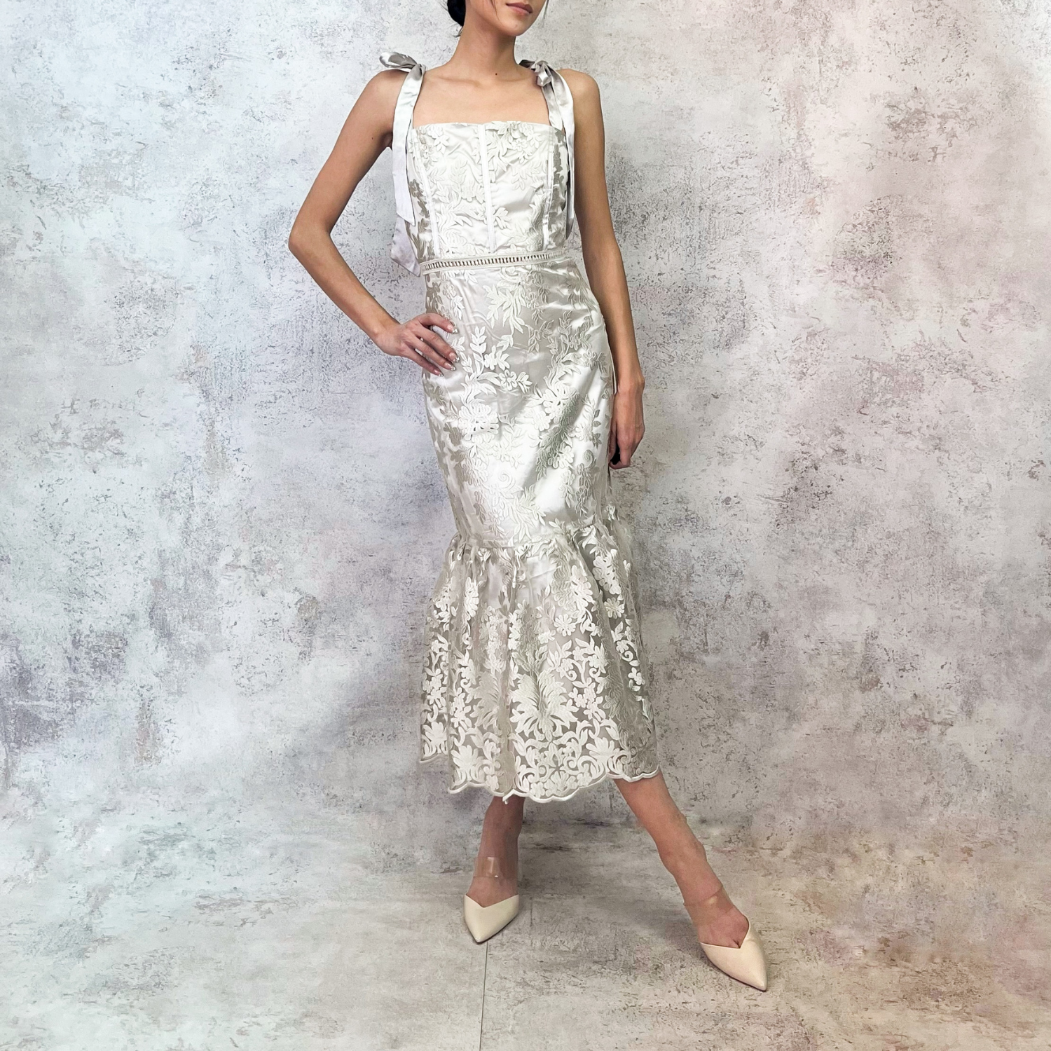 Vestido de corte recto confeccionado en base de crepé mate con capa superior de organza translúcida. Escote redondo y tirantes con detalle de moños.
