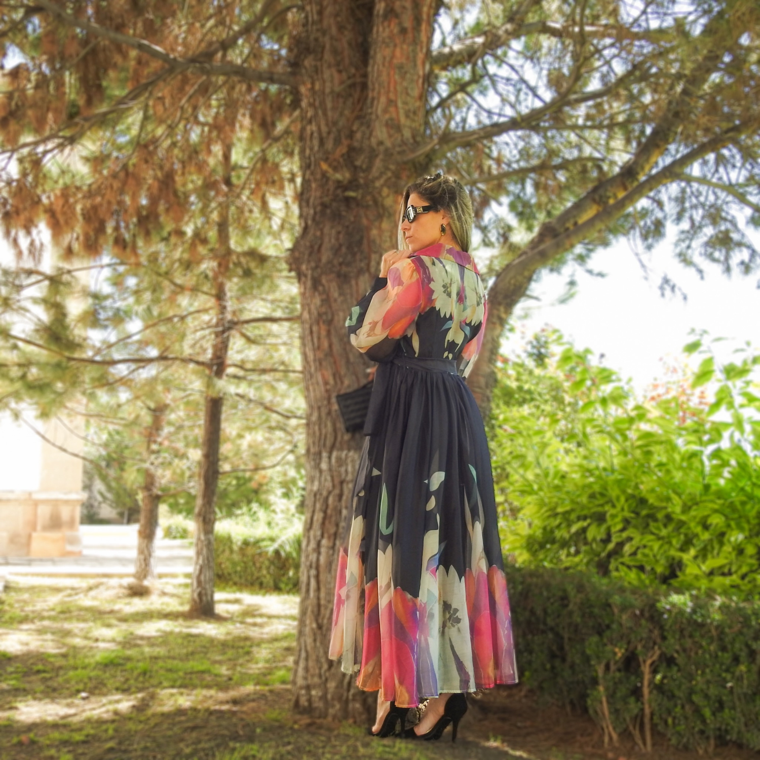 Vestido midi negro con estampado flores rosa, en tela de organza.