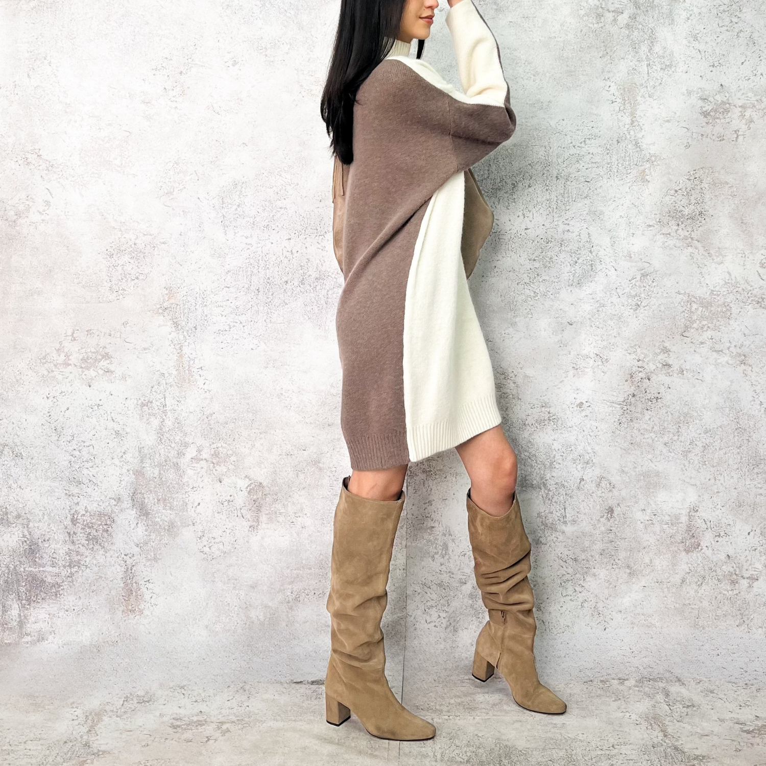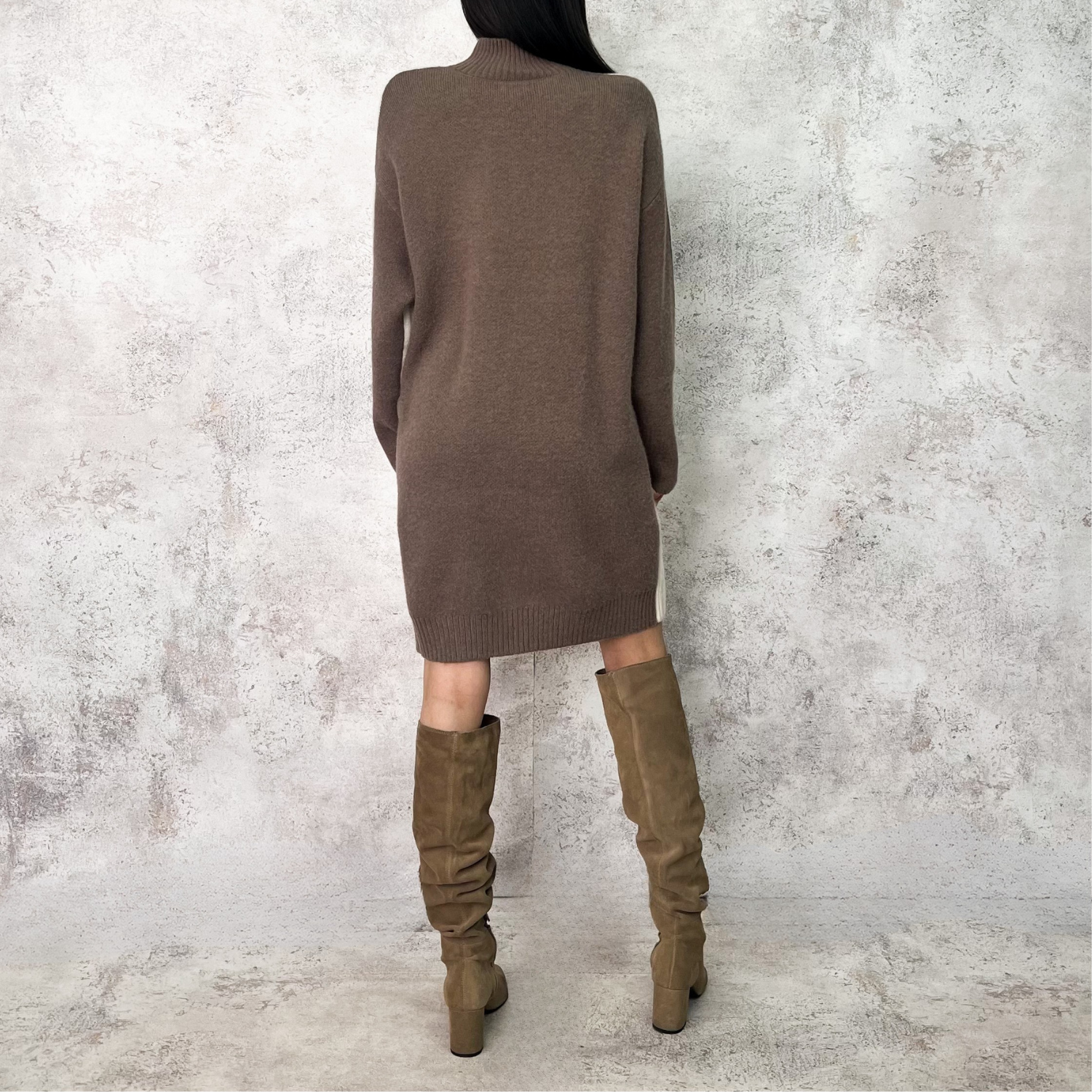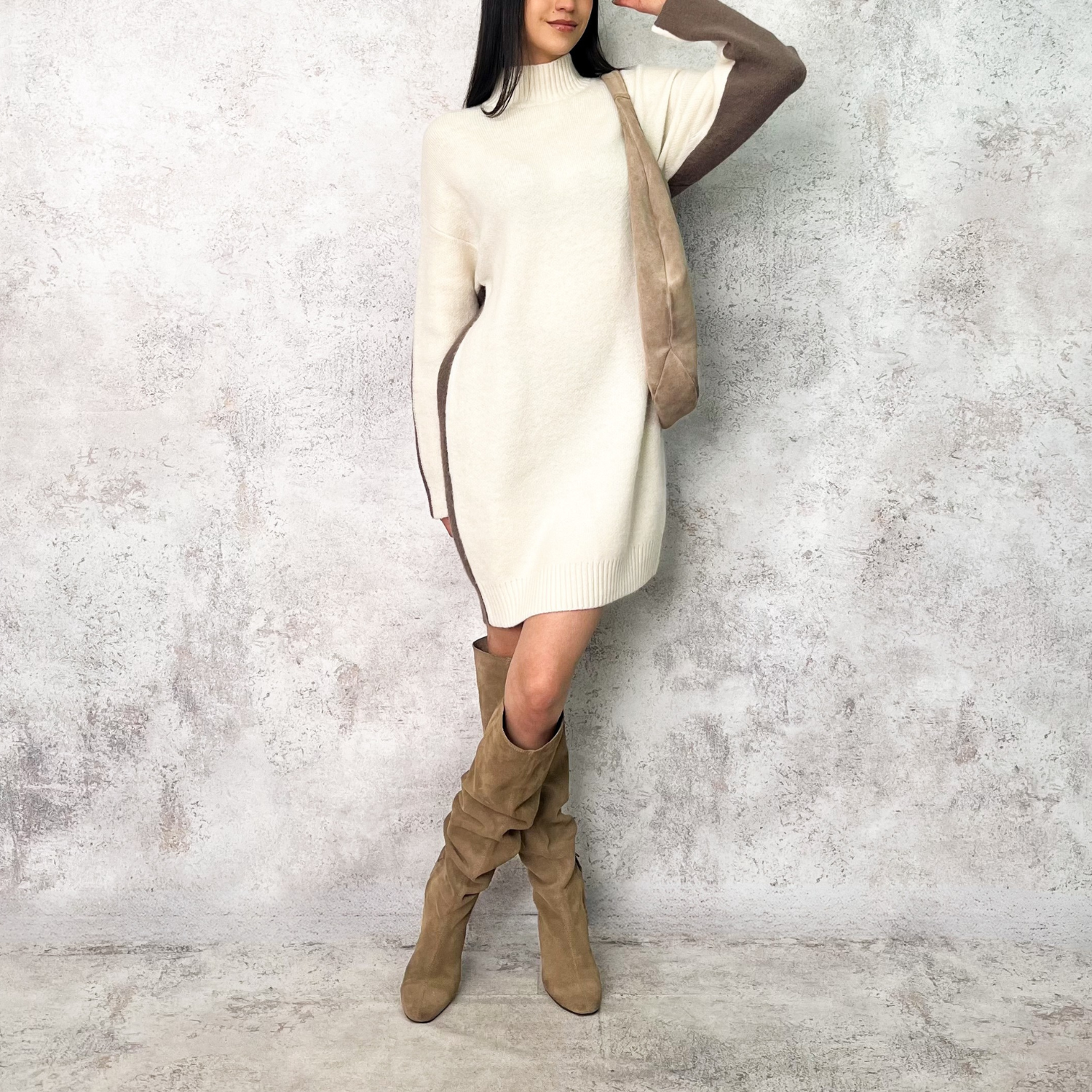 Vestido bicolor corto, en tejido punto fino. Ivory/Beige.