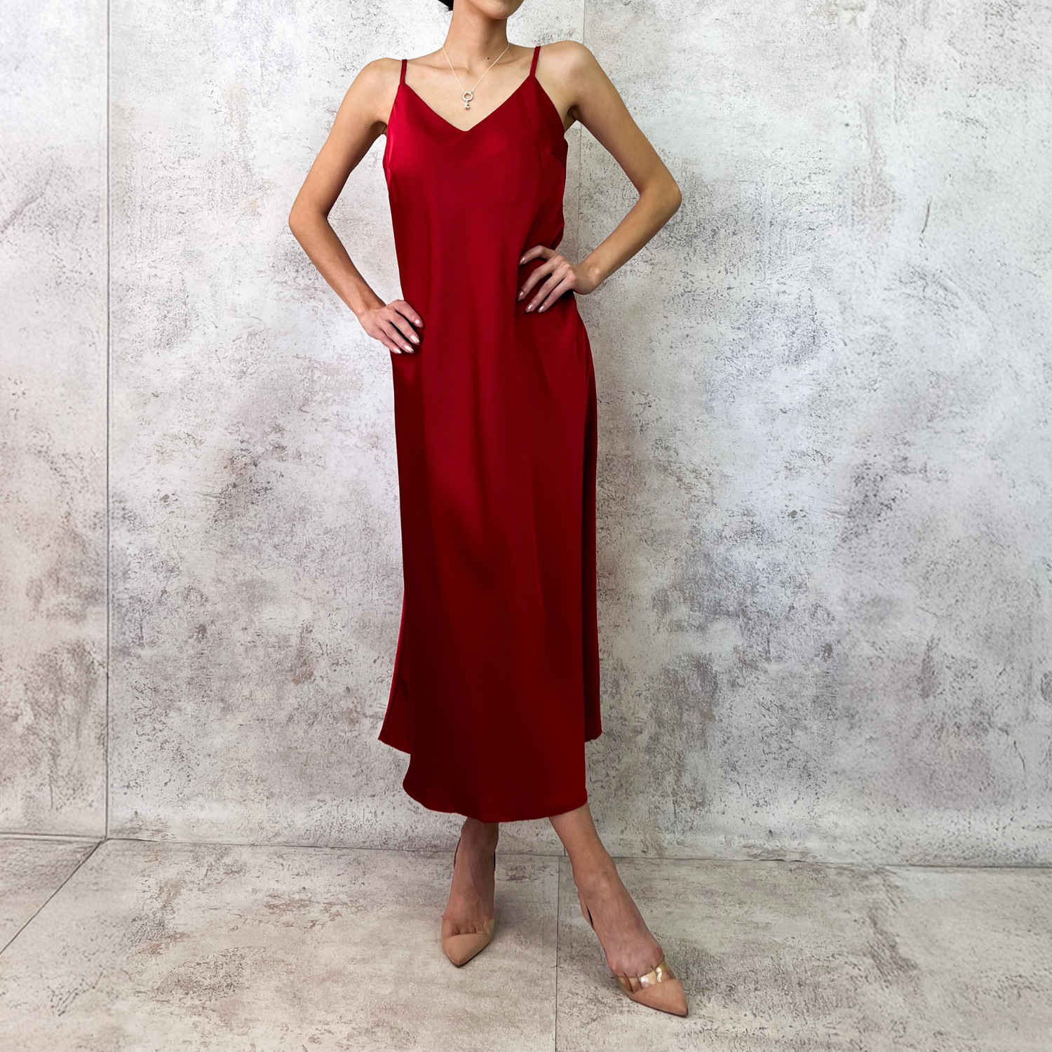 Vestido midi de satín lencero con capa superior de gasa semitransparente. Corte recto y escote asimétrico.